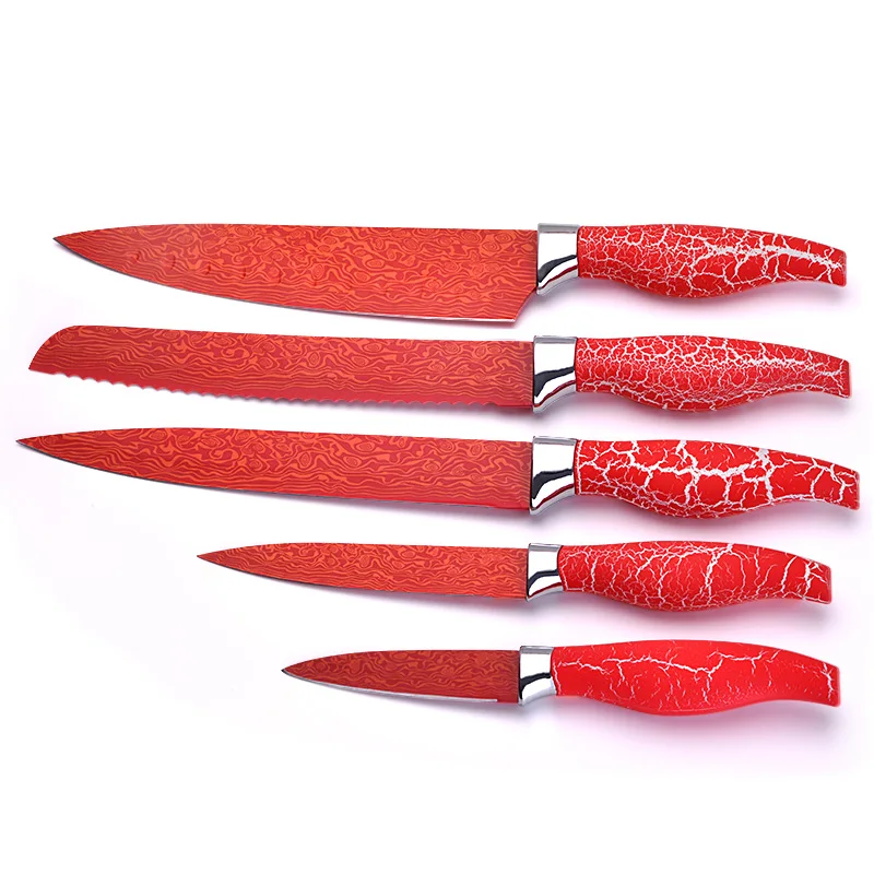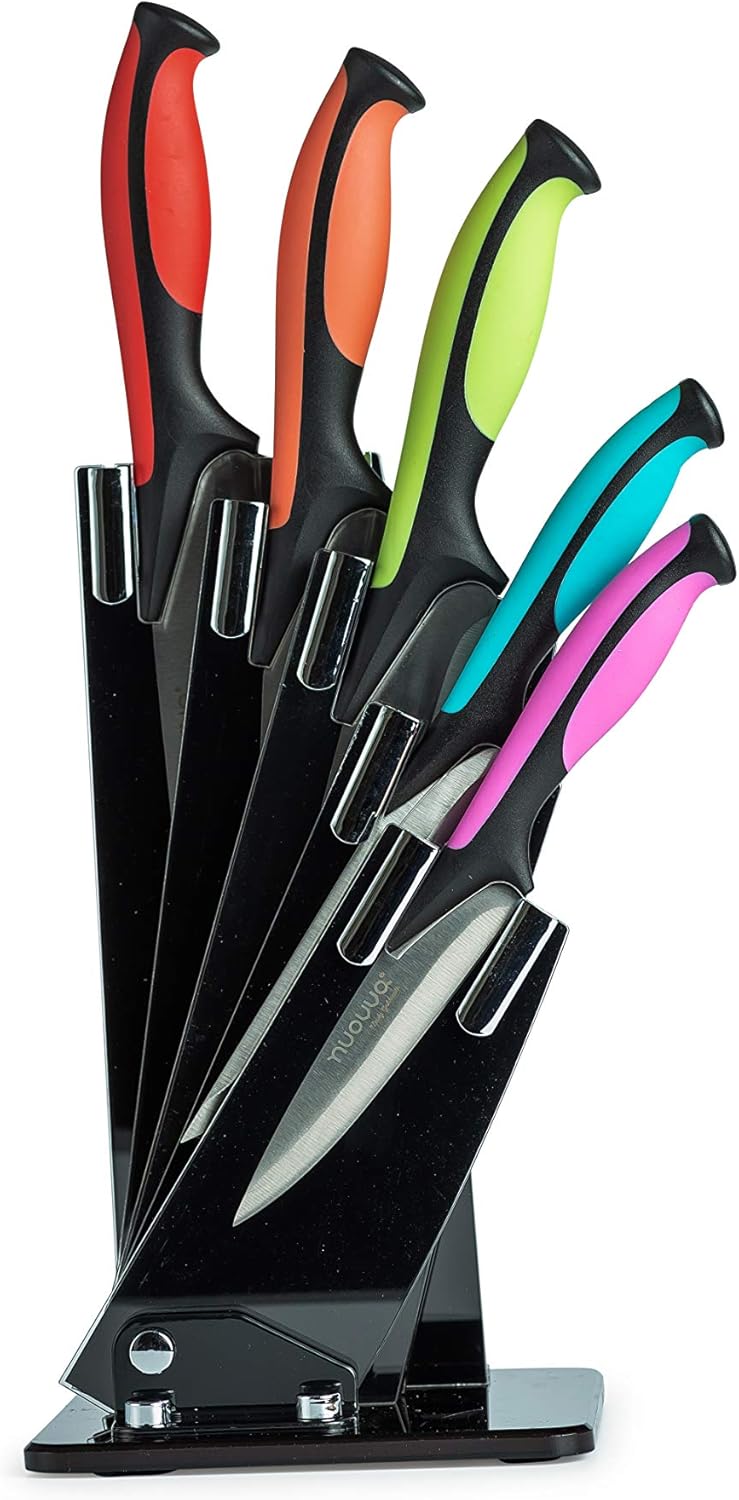 Coloured Knife Set With Stand - Knives (5) (1) paring knife (3.5) (1)bird's beak paring knife (2.75) (1)gladiator series honing steel (10) (1)exquisite gift packaging (1)handmade walnut wood block dalstrong perfectfit saya (sheath) not included.